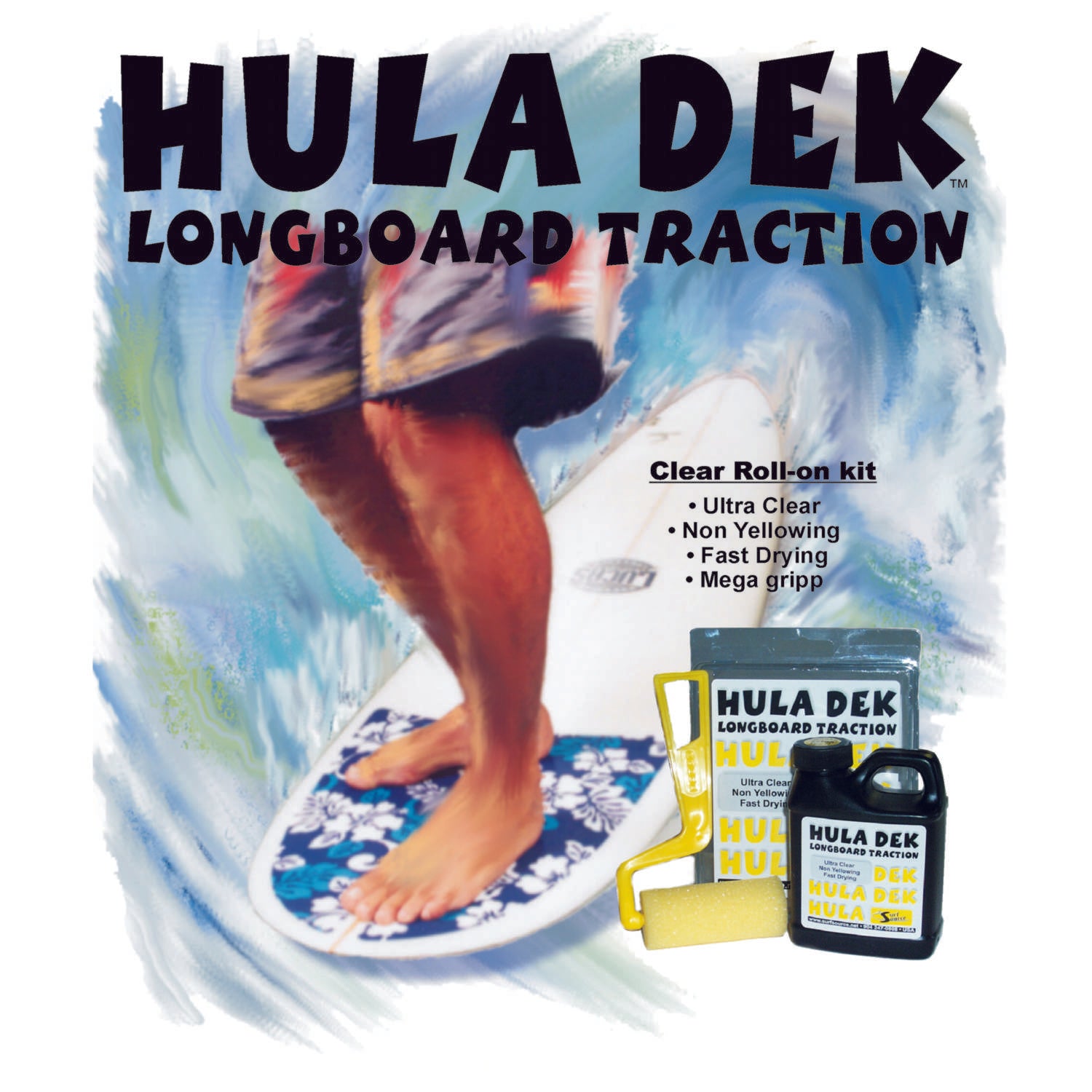 Never wax again using HULA DEK, Ultra Clear, Ultra grippy permanent long board traction. This kit provides an easy step application process that allows you to customize the areas where permanent, no-slip traction is needed. HULA DEK can be applied right over fabric nose inlays and artwork without hiding or distorting them. HULA DEK can be cleaned with soap or wax remover. If needed, HULA DEK can also be removed with 320 wet sanding or waxed over.