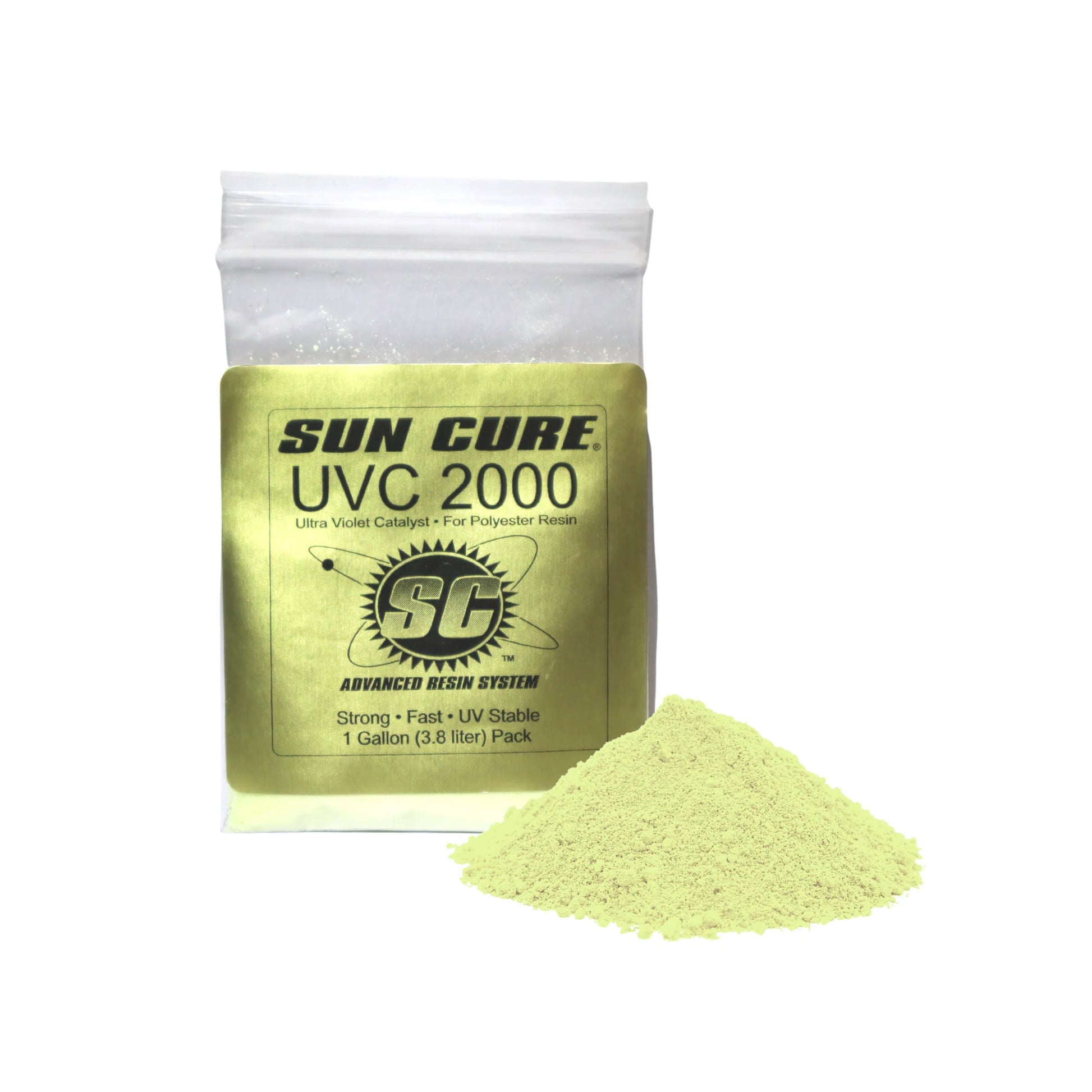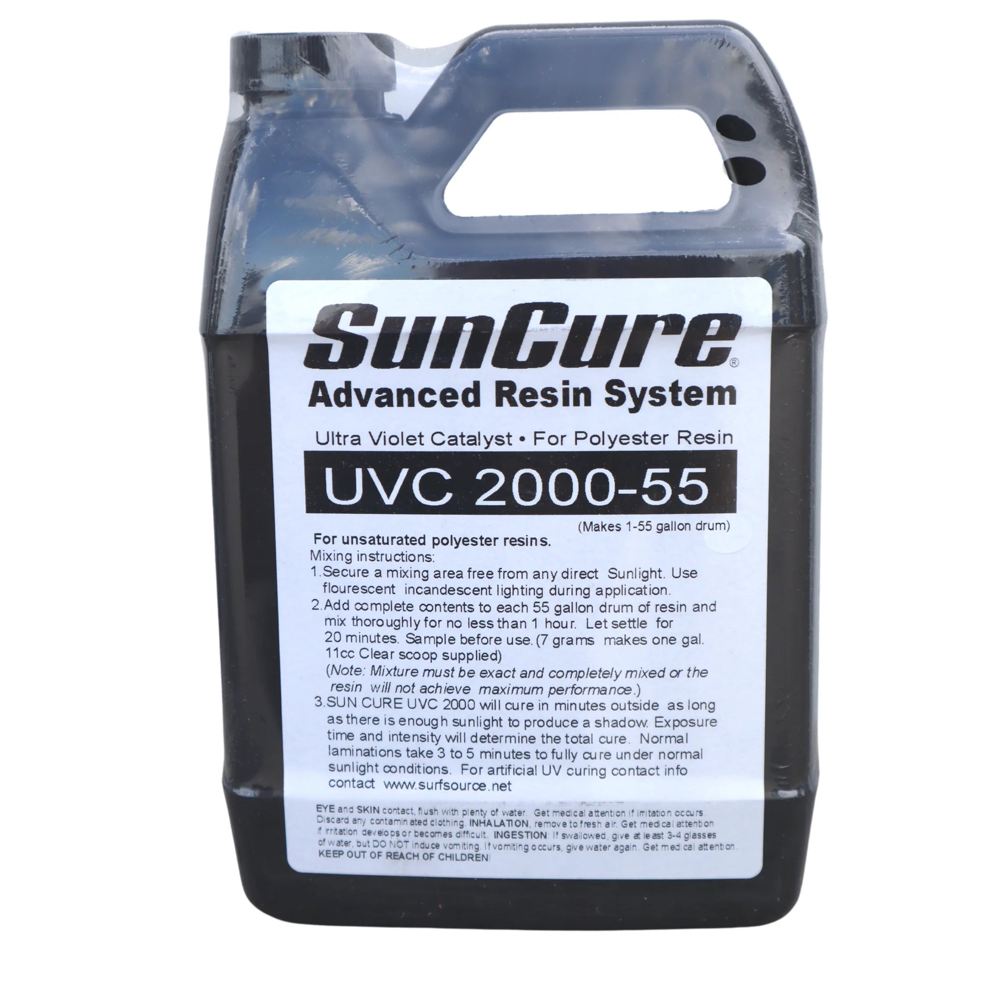 Sun Cure UVC 2000 is an Ultra Violet Catalyst that is added to your Polyester resin (SILMAR® brand is preferred for best results) to make it cure, “within minutes,” when exposed to Ultra Violet light produced from the sun or artificial light source (tanning bulbs) in the 9.5 UVB range curing between 260 - 320 nanometers. SunCure resin can also be cured, away from UV light, by the use of MEKP, (Liquid Hardener)